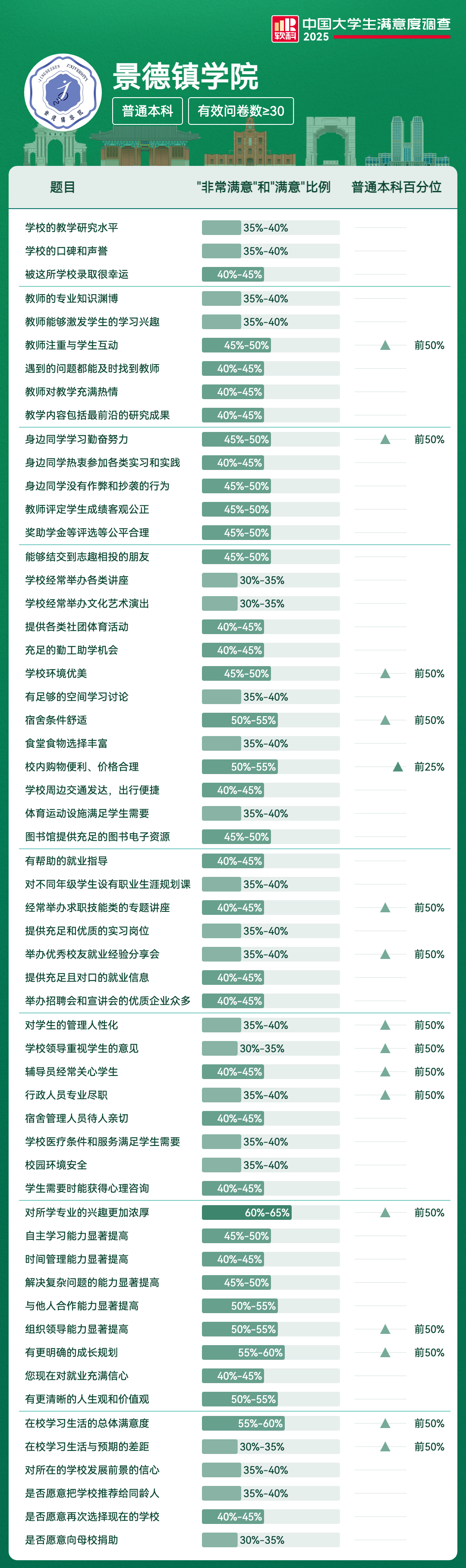 | 宿舍条件舒适 | 50%-55% | 前50% |