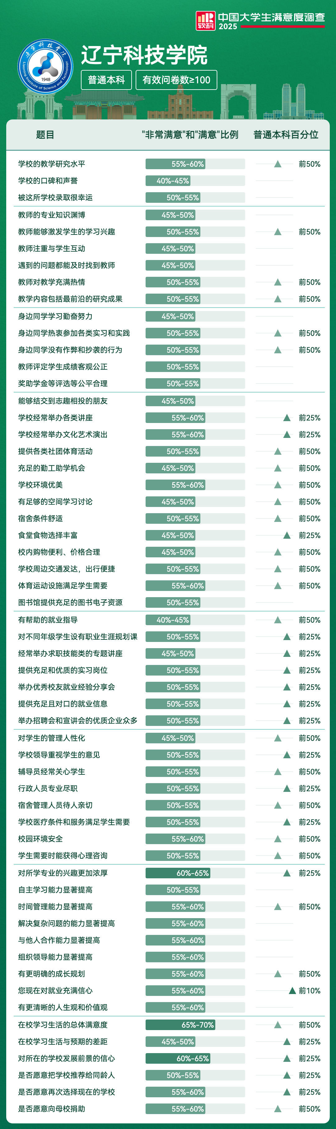 | 满意度前5项 | 满意及以上比例 | 全国高校排名区间 |