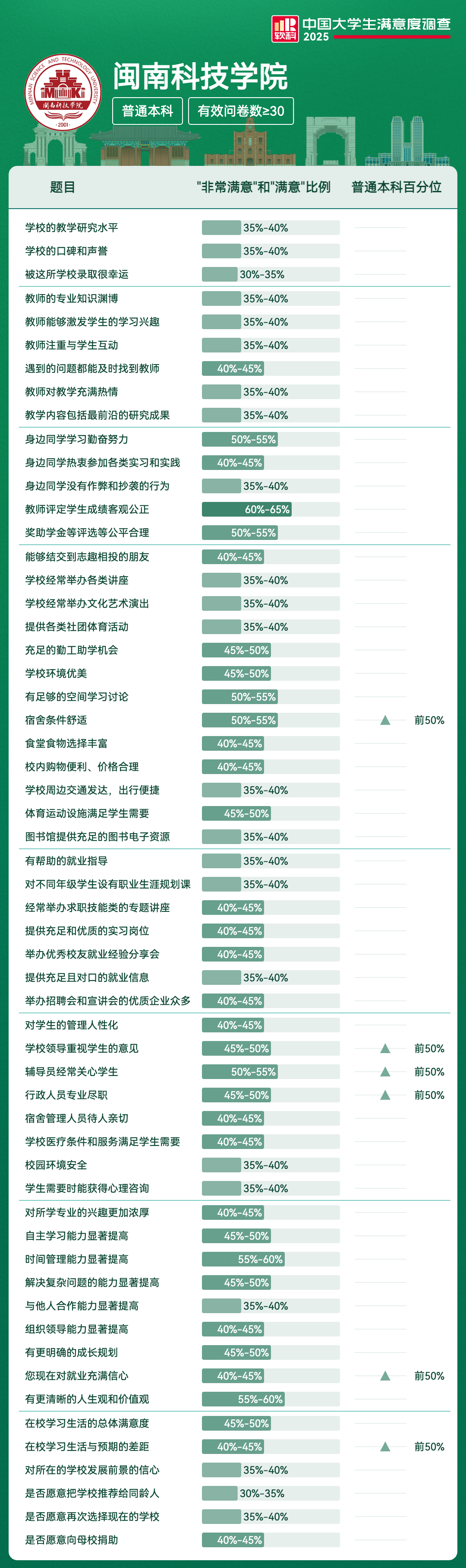 | 宿舍条件舒适 | 50%-55% | 前50% |