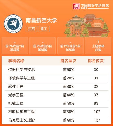 南昌航空大学位于江西省会南昌,是江西省人民政府与国家国防科技工业局共建的具有航空、国防特色的高等学校,入选教育部“卓越工程师教育培养计划”“国家级大学生创新创业训练计划”“国家级新工科研究与实践项目”,获评国防科技工业“军工文化教育基地”等。学校以工为主,工、理、文、管、经、法、教、艺等学科协调发展。学校创建于1952年,是全国首批学士学位授予单位。1985年开始培养硕士研究生,1990年获硕士学位授予权。1999年开始实行中央与地方共建、以地方政府管理为主的管理体制。南昌航空大学秉承“日新自强、知行合一”的校训、“勤奋、文明、求实、创新”的校风和“团结自强、拼搏向上”的昌航精神,坚持“立足江西、面向全国,服务地方、服务国防”的服务面向,以航空国防需求为导向,积极服务国家航空工业和江西地方经济社会发展,目前,学校已经初步建成为工科优势明显、航空特色鲜明的本科高校。