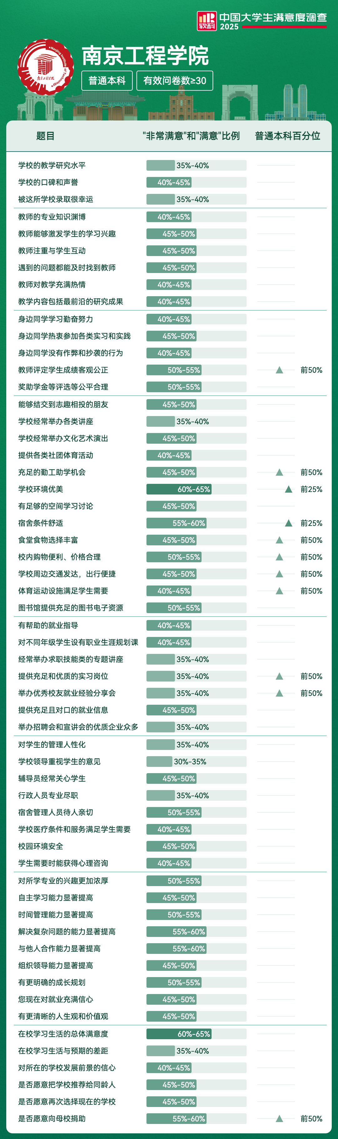 宿舍条件舒适 | 55%-60% | 前25% |