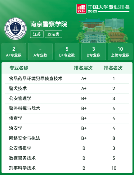 南京警察学院是公安部直属本科高等院校。学院前身是1949年5月新生的南京市立农业职业学校,其办学历史可追溯至1941年。1953年8月更名为江苏省南京林业学校,1994年9月,改建为林业部南京人民警察学校;2000年3月,升格为南京森林公安高等专科学校;2010年3月,升格为南京森林警察学院,开始举办全日制普通本科教育;2018年12月,由国家林业和草原局划转公安部领导管理;2022年6月,公安部南京警犬研究所并入学院;2023年2月,经教育部批准,更名为南京警察学院。学院位于江苏省南京市,占地总面积1346亩,建筑面积23.58万㎡,设有仙林、花园路、安德门3个校区,其主校区位于南京栖霞区仙林大学城。