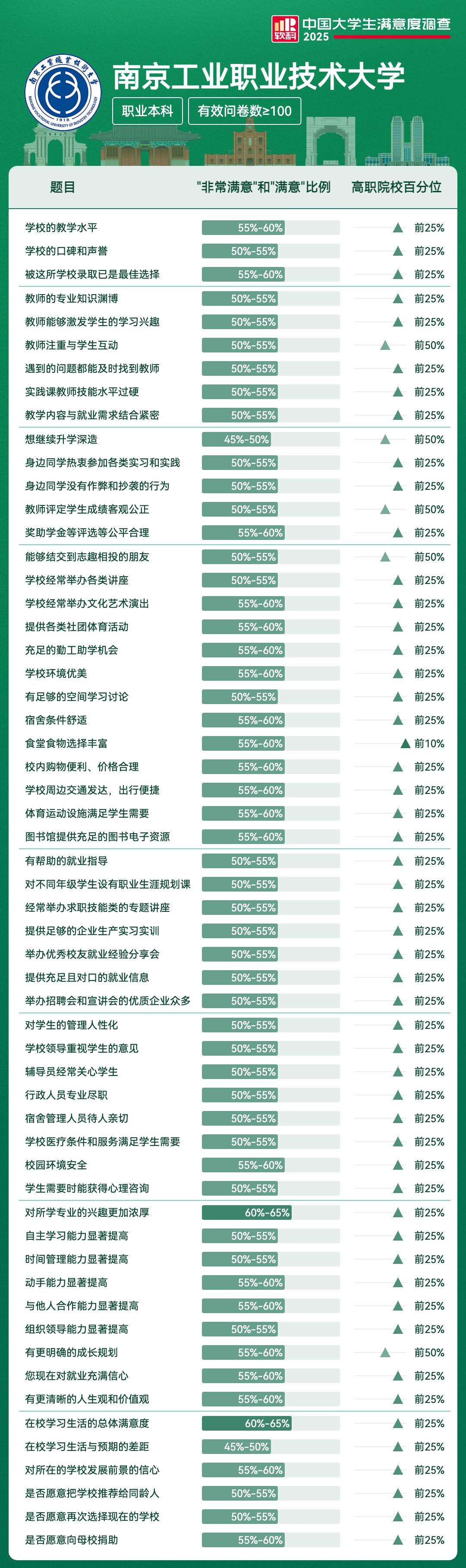 | 满意度前5项 | 满意及以上比例 | 全国高校排名区间 |