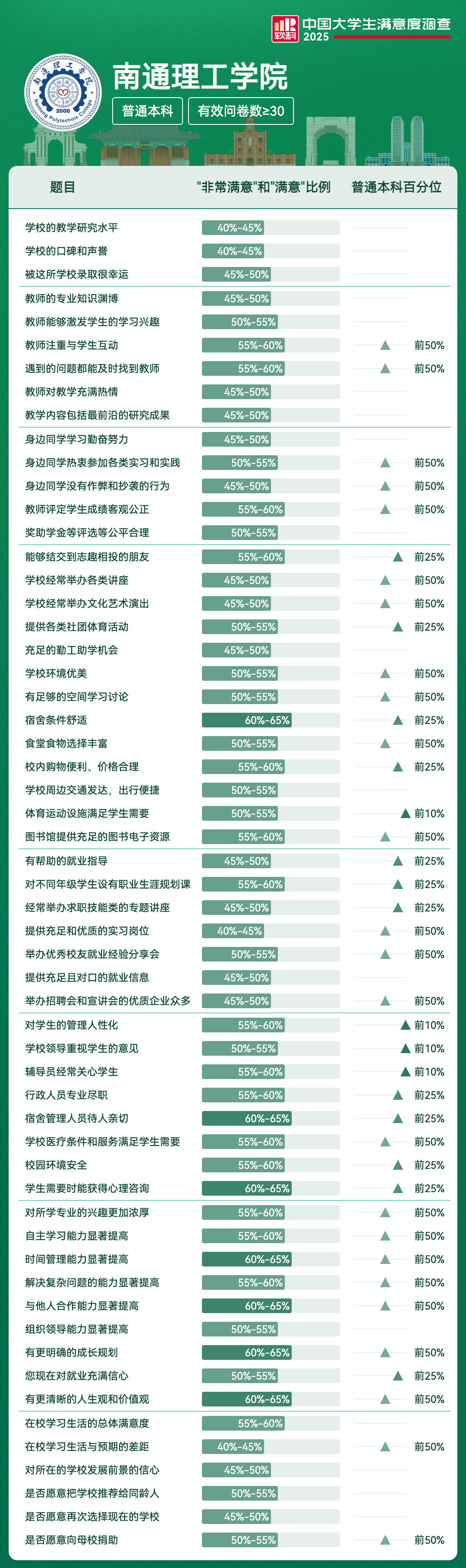 | 学校领导重视学生的意见 | 50%-55% | 前10% |