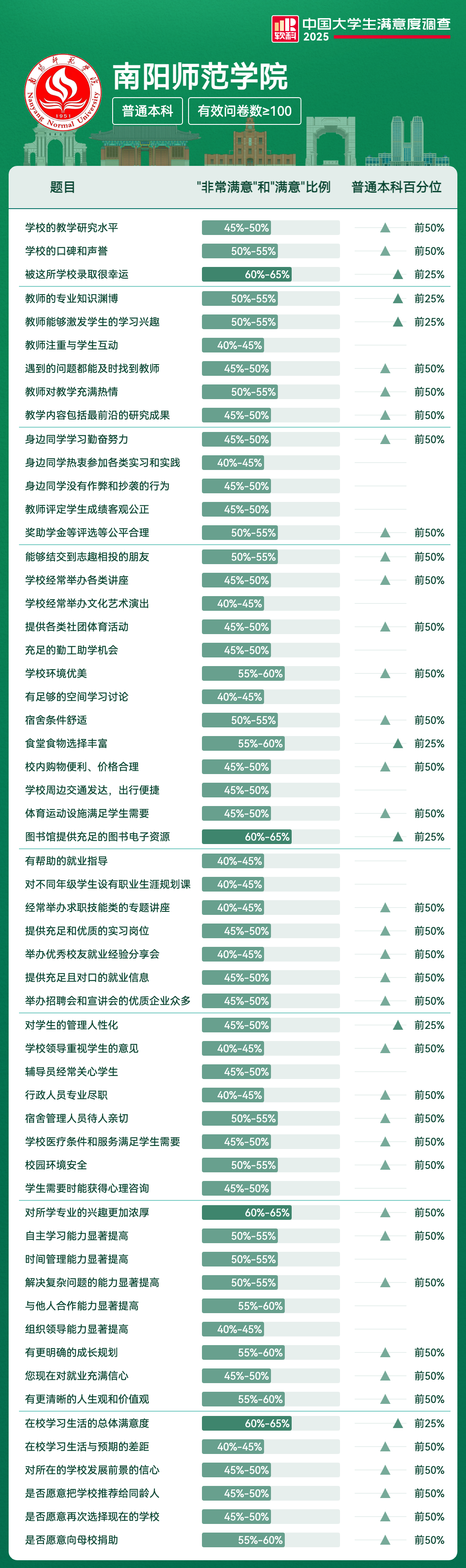 | 满意度前5项 | 满意及以上比例 | 全国高校排名区间 |