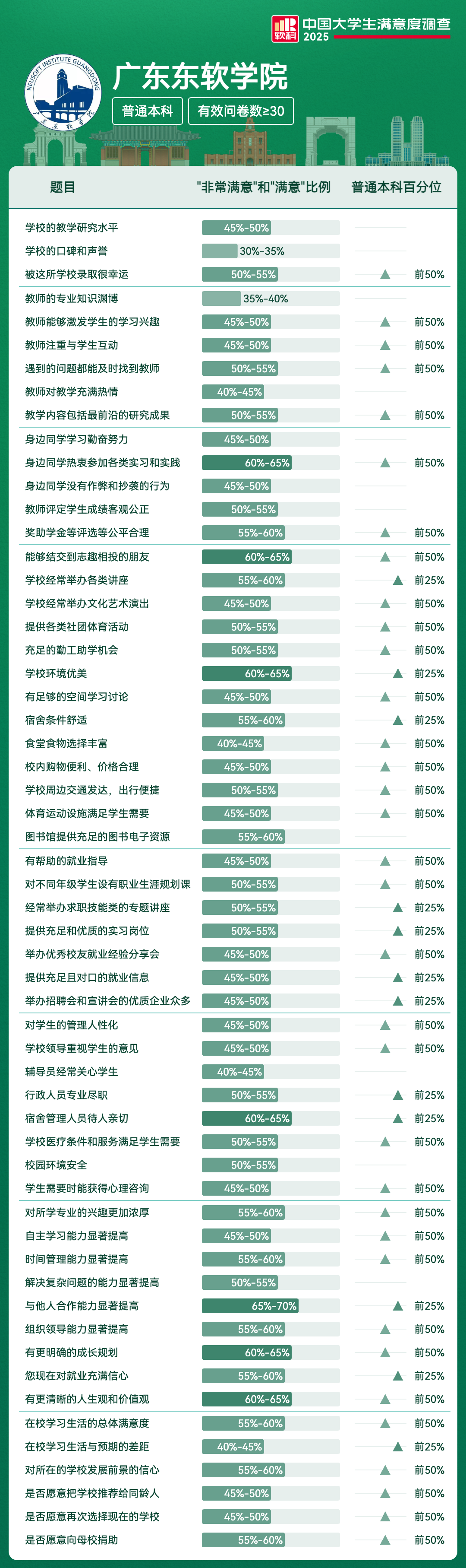 | 宿舍条件舒适 | 55%-60% | 前25% |