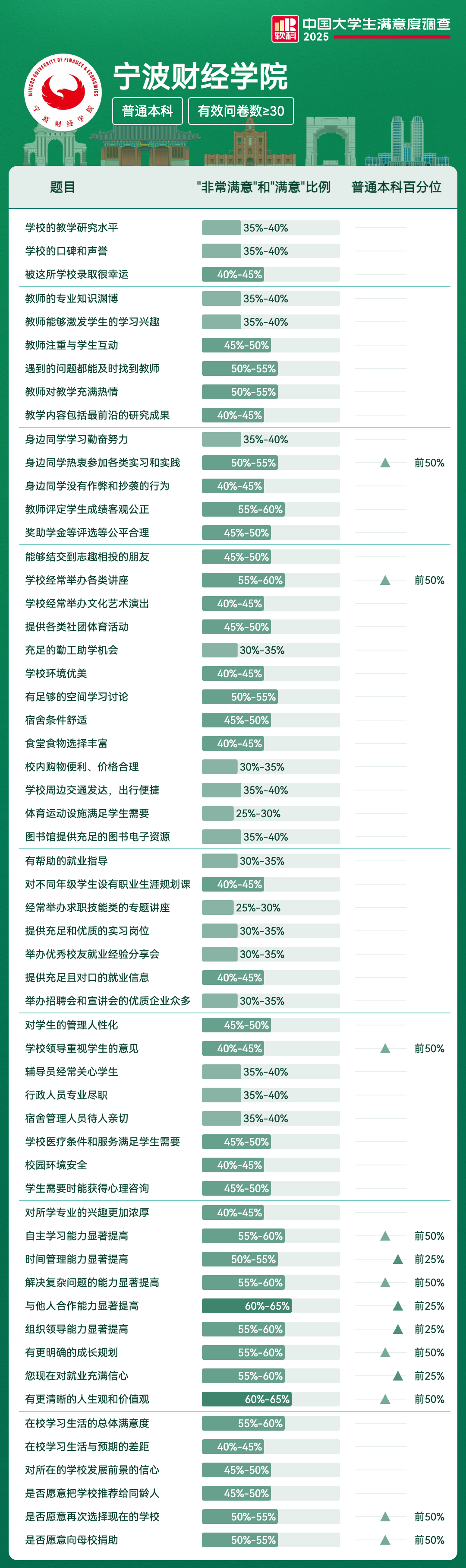 | 满意度前5项 | 满意及以上比例 | 全国高校排名区间 |