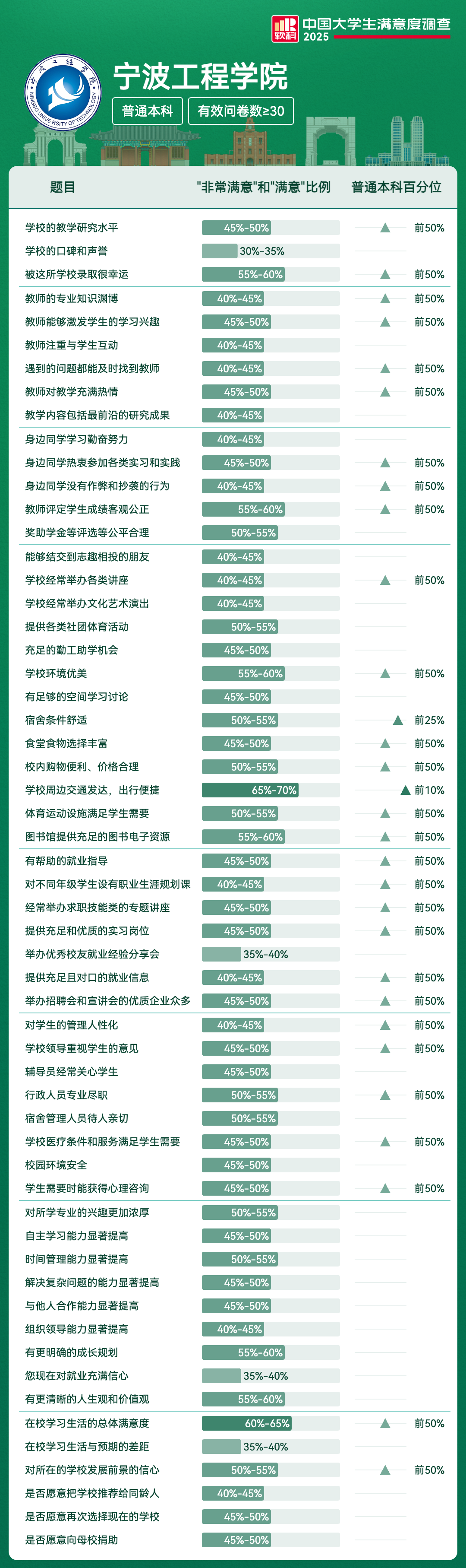 | 宿舍条件舒适 | 50%-55% | 前25% |