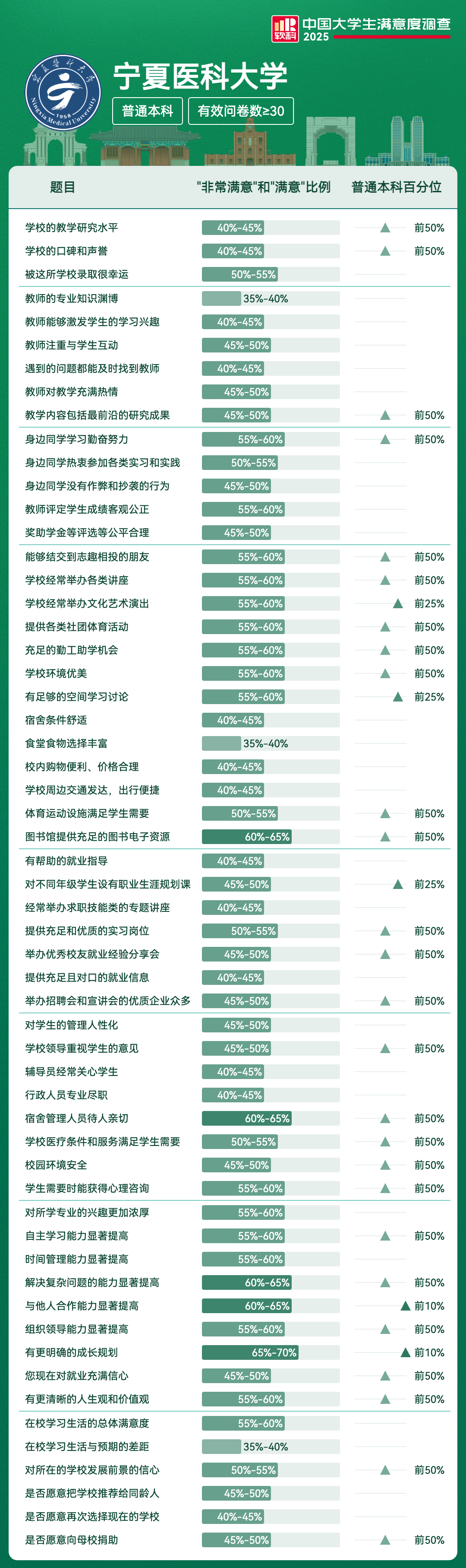 满意度前5项 | 满意及以上比例 | 全国高校排名区间 |