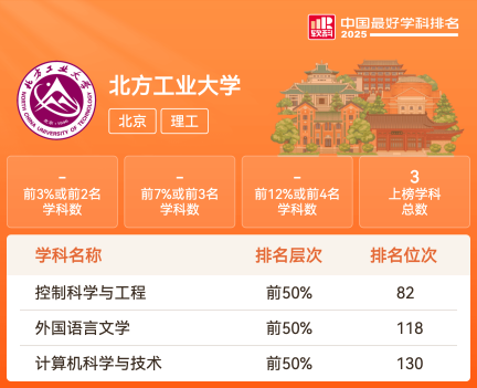 北方工业大学创立于1946年,位于北京市石景山区,是一所以工为主、文理兼融,具有学士、硕士、博士培养层次和高水平运动队招收资格的多科性高等学府,具有硕士研究生免试推荐资格,是教育部“卓越工程师培养项目”院校。学校有理、工、文、经、管、法、艺七大学科门类。工程学科进入ESI全球排名前1%。现有1个服务国家特殊需求博士人才培养项目,17个硕士学位一级学科,10个硕士专业学位类别。2020年37个本科专业,包括3个国家级特色专业、8个教育部双万计划一流专业。 学校坚持工科做强、理科做精、文科做亮,以控制工程与计算机应用为特色,强化大数据与人工智能、智能制造与建造、电子信息与微电子、安全与环境等新的交叉学科发展方向,以“智能、智慧、智造”为特色的一批新工科得到发展壮大。优美的环境、人性化的管理、优良的学风,形成了办学和育人的多项优势,北方工业大学努力办成“对学生最好的大学”。