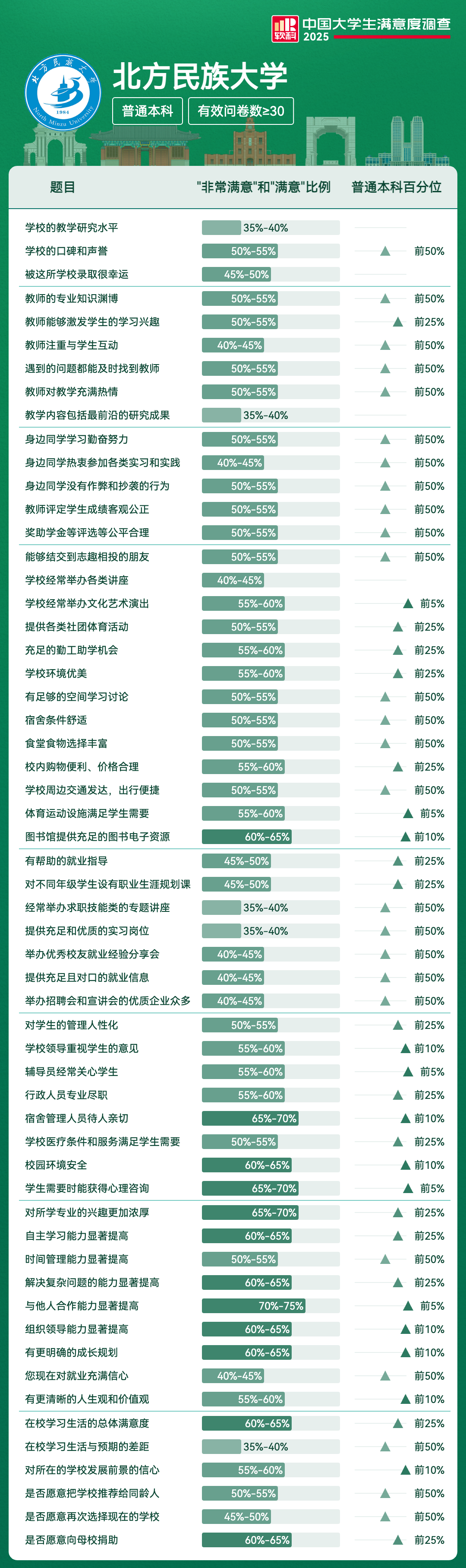 满意度前5项 | 满意及以上比例 | 全国高校排名区间 |