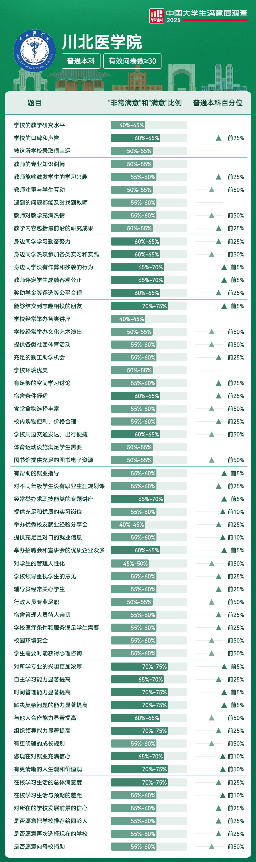 | 满意度前5项 | 满意及以上比例 | 全国高校排名区间 |