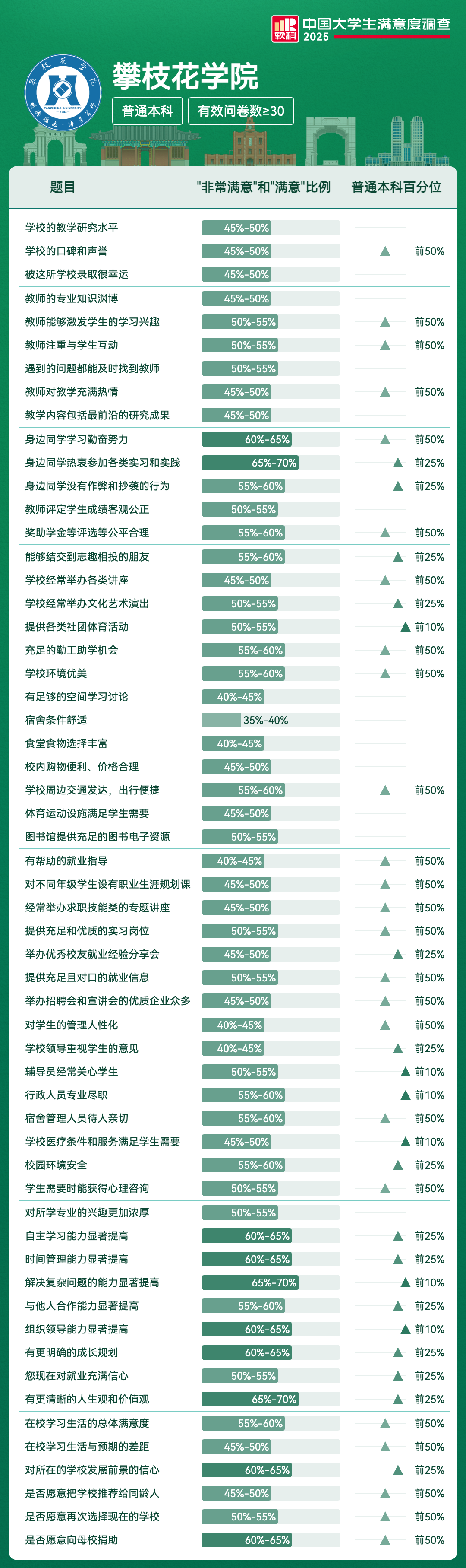 | 满意度前5项 | 满意及以上比例 | 全国高校排名区间 |