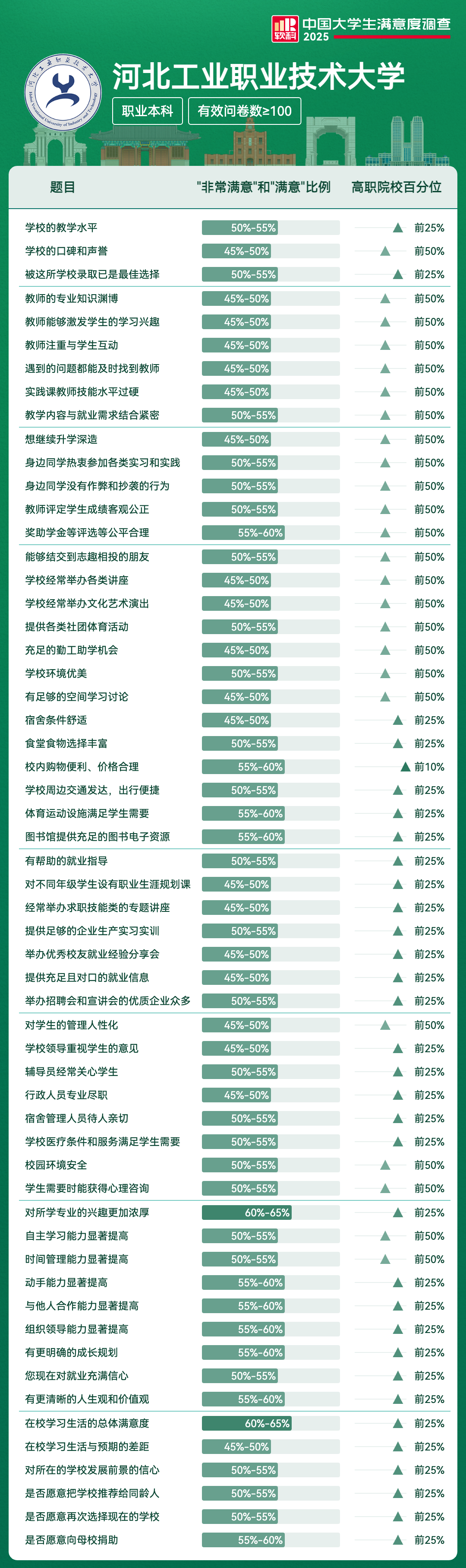 | 宿舍条件舒适 | 45%-50% | 前25% |