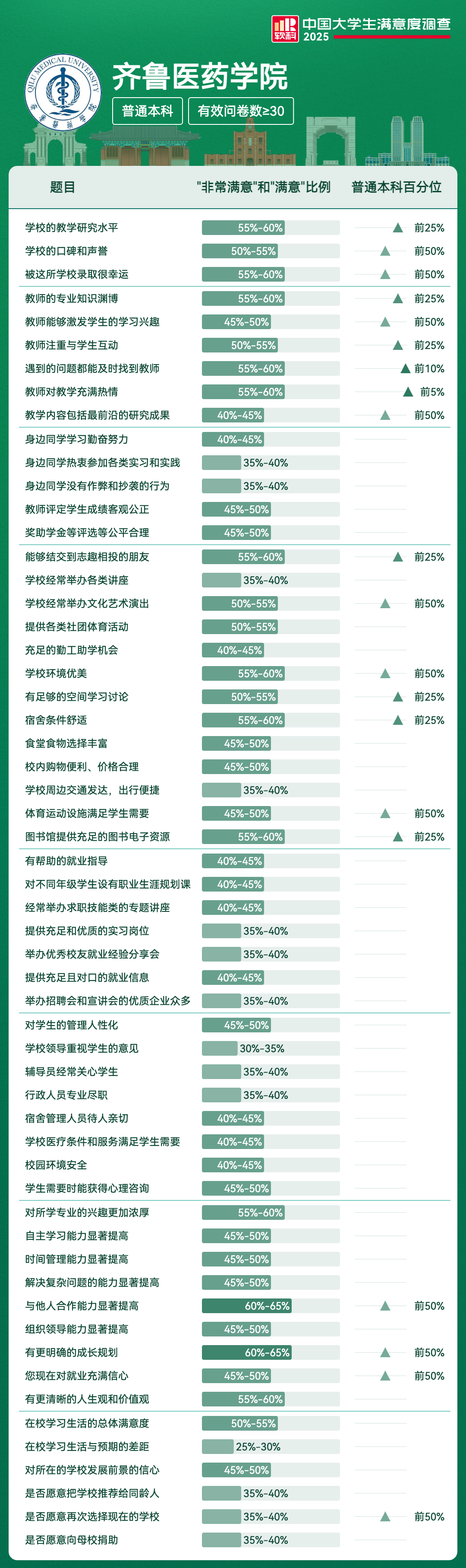 | 满意度前5项 | 满意及以上比例 | 全国高校排名区间 |