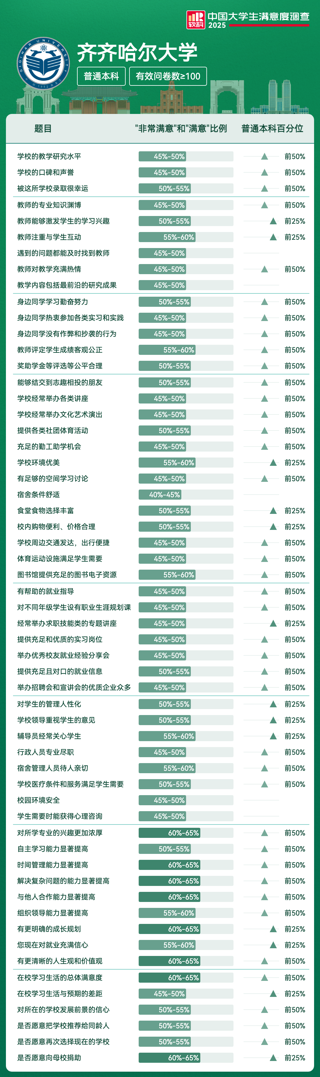 | 学校环境优美 | 55%-60% | 前25% |