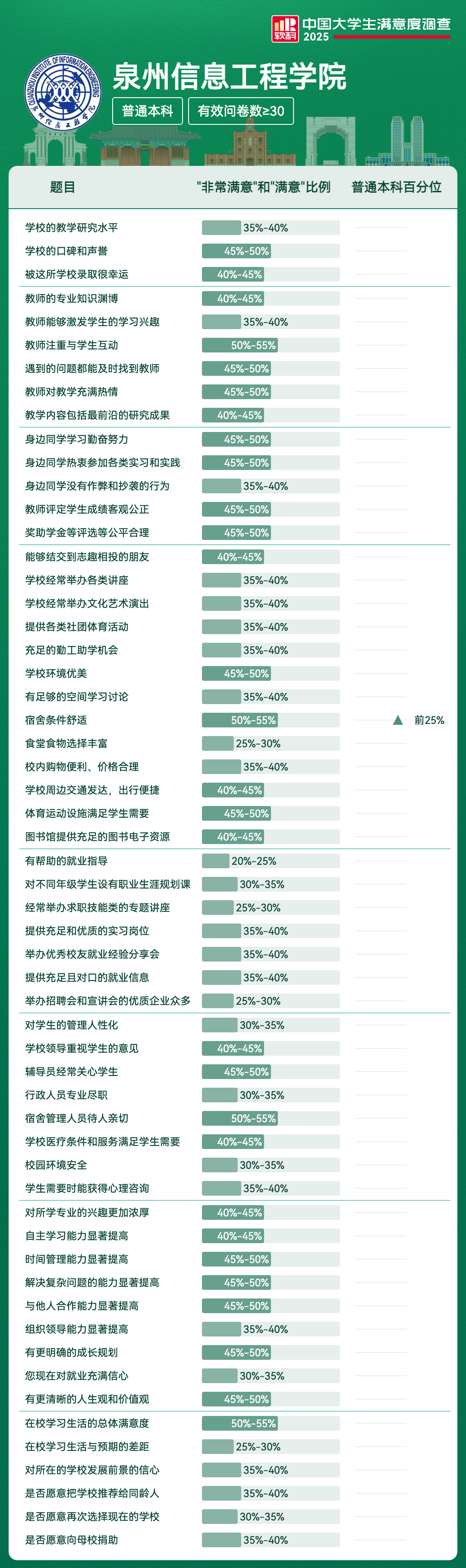 | 宿舍条件舒适 | 50%-55% | 前25% |