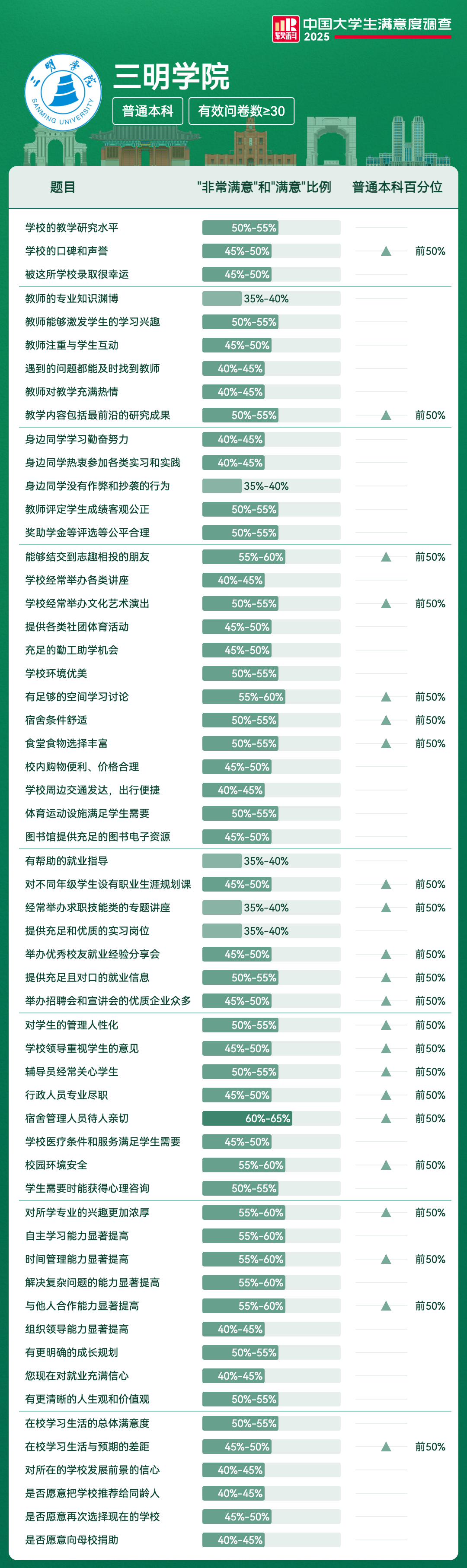 | 满意度前5项 | 满意及以上比例 | 全国高校排名区间 |