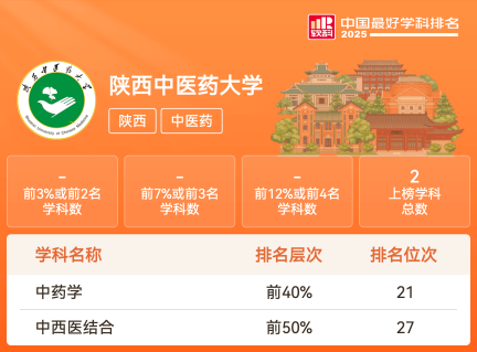 陕西中医药大学是陕西惟一一所培养高级中医药人才的普通高等院校,前身是1952年创建于西安的西北中医进修学校。1959年升格为陕西中医学院,1978年中共中央56号文件确定的全国8所重点建设的中医院校之一,1978年开始招收培养硕士研究生,1981年成为全国首批硕士授权单位,1990年被教育部批准为首批有条件接收国外留学生、港澳台地区学生的高等院校。2015年更名为陕西中医药大学。