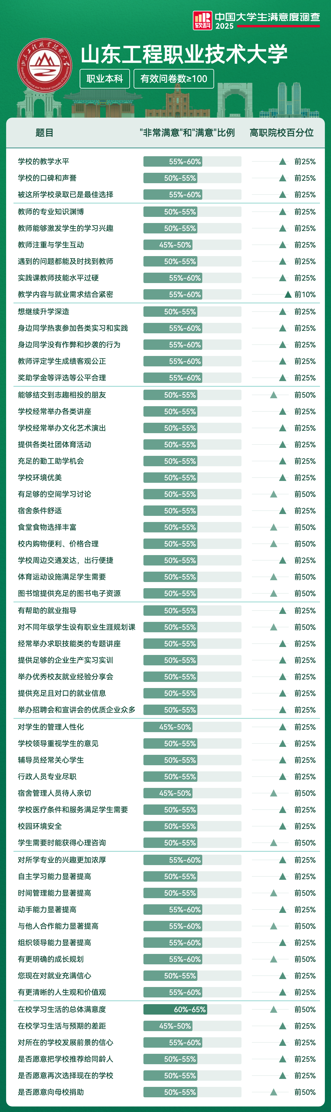 | 满意度前5项 | 满意及以上比例 | 全国高校排名区间 |