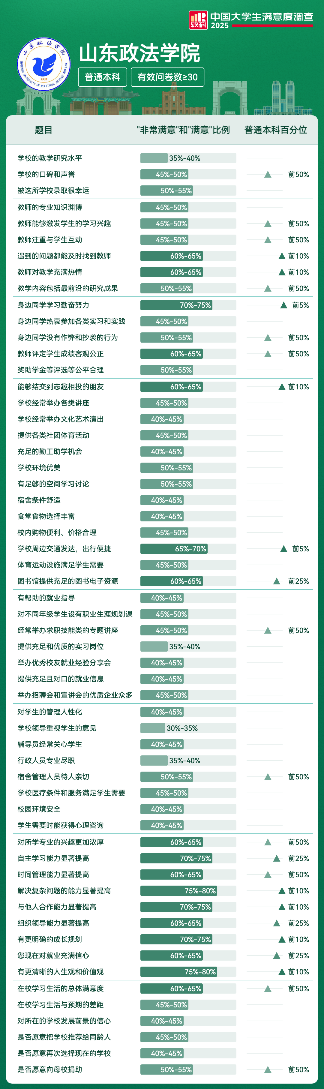 | 满意度前5项 | 满意及以上比例 | 全国高校排名区间 |