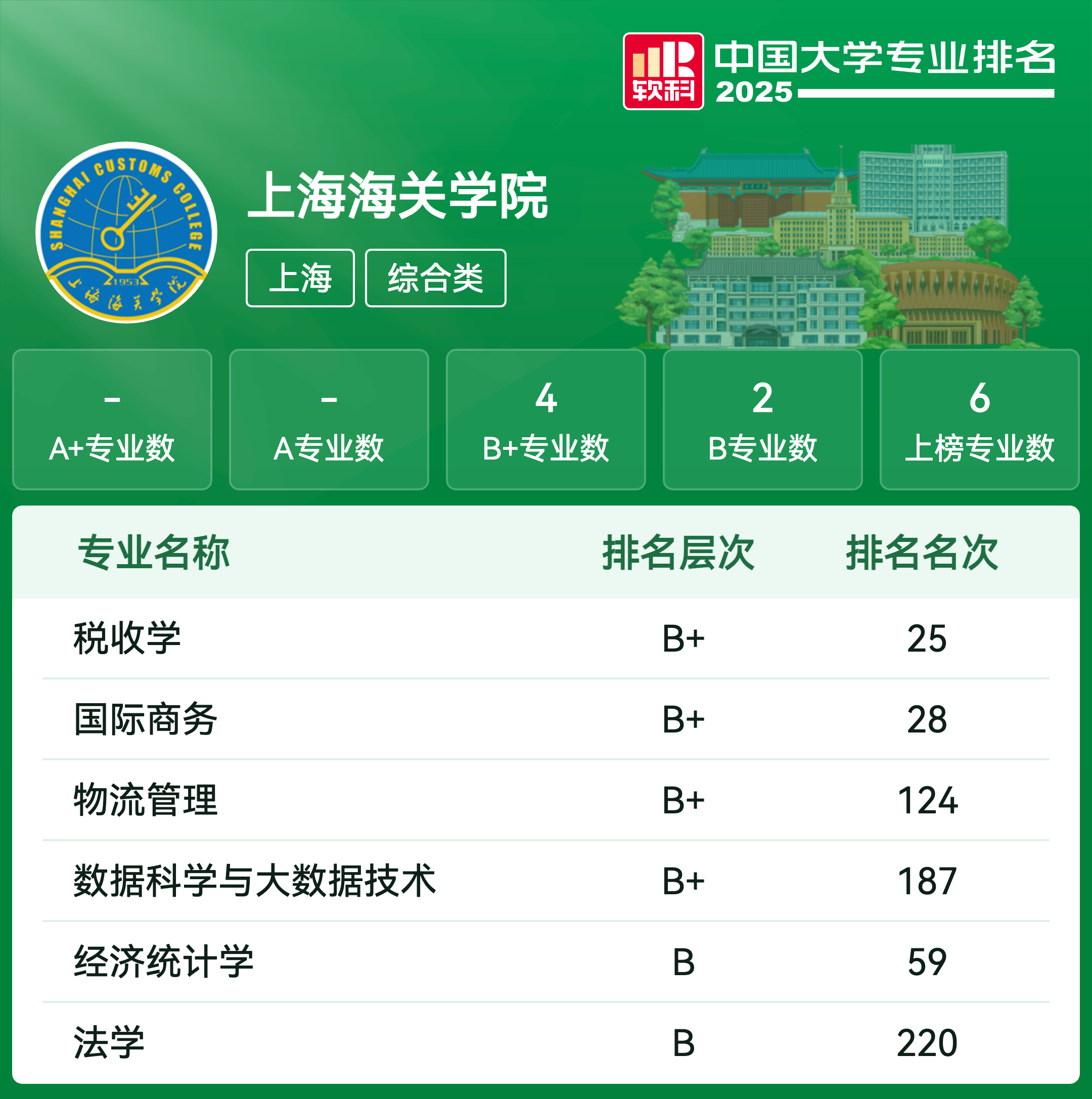 | 专业代码 | 专业名称 | 评级 | 专业排名 |