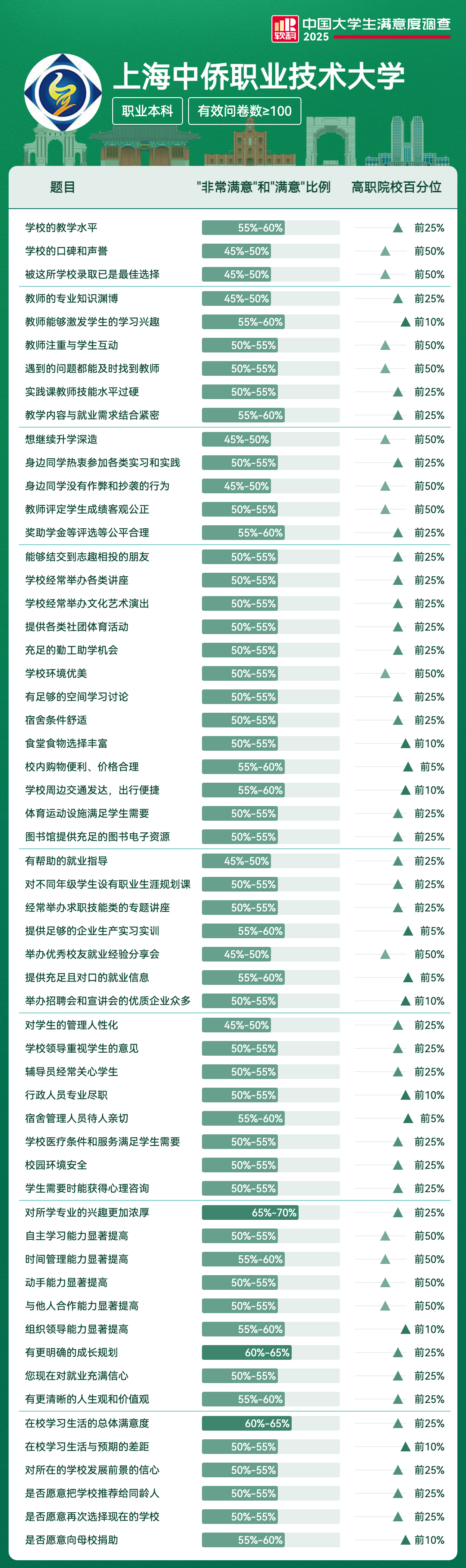 | 宿舍管理人员待人亲切 | 55%-60% | 前5% |