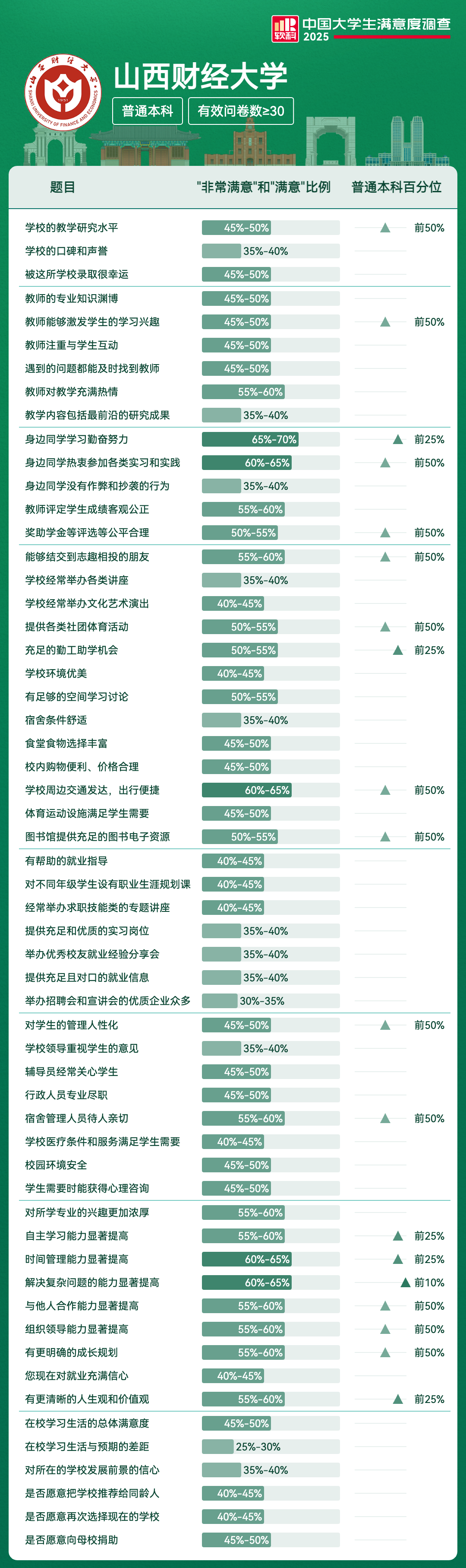 满意度前5项 | 满意及以上比例 | 全国高校排名区间 |