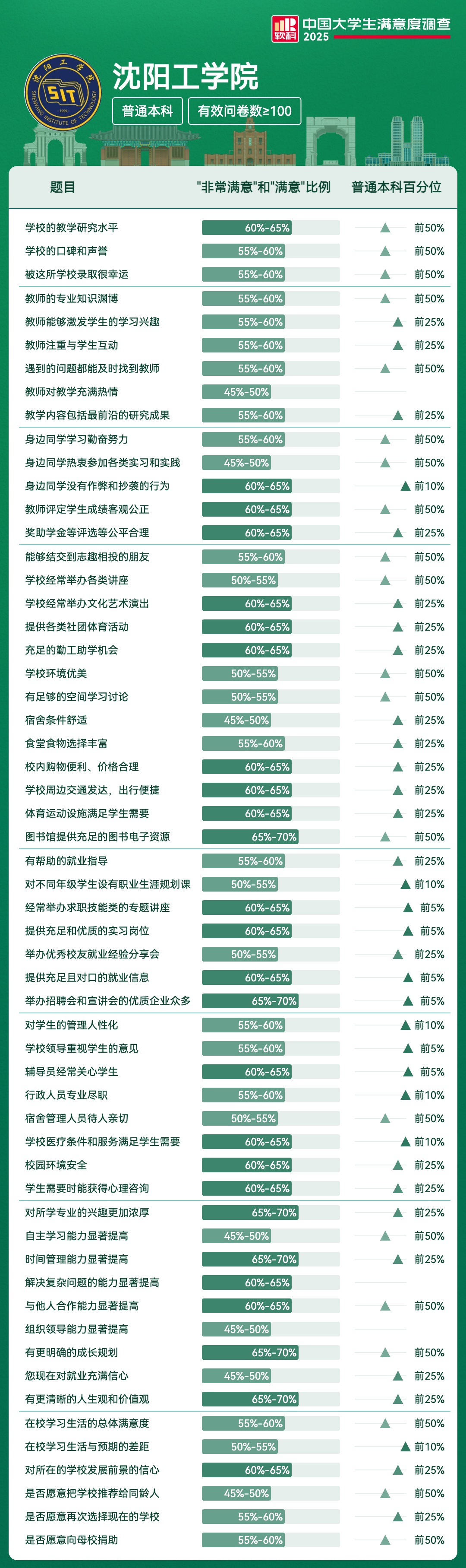 | 满意度前5项 | 满意及以上比例 | 全国高校排名区间 |