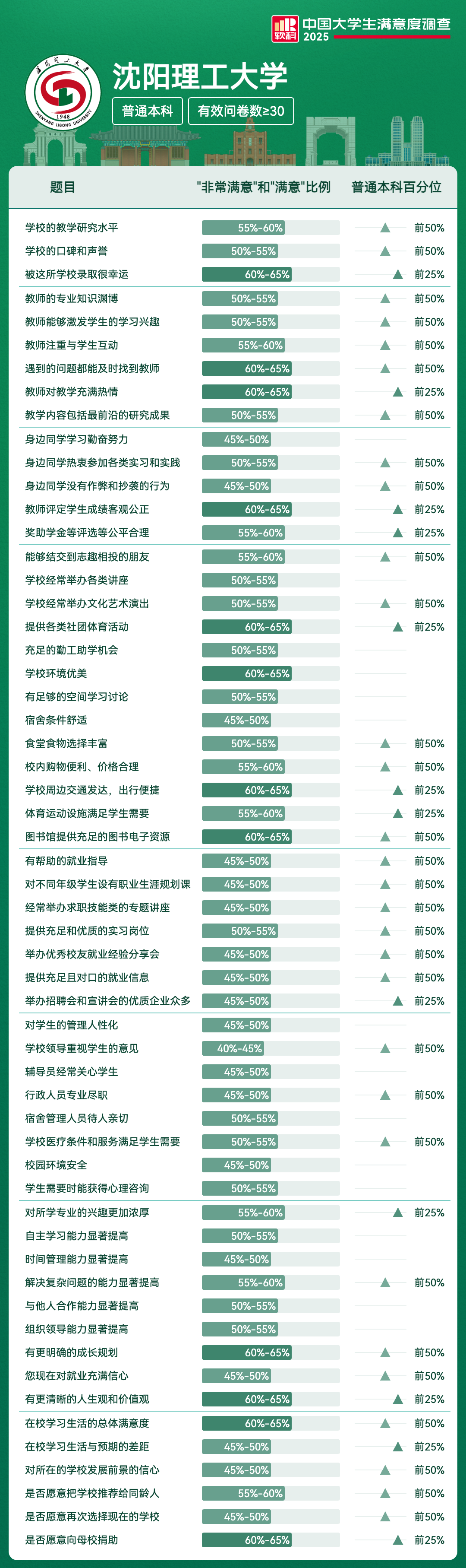 | 提供各类社团体育活动 | 60%-65% | 前25% |