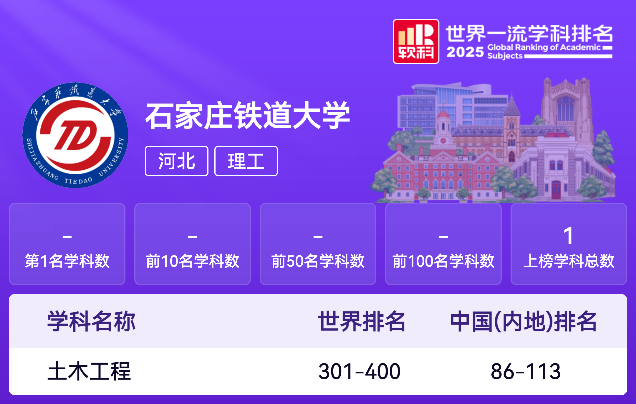 石家庄铁道大学前身是中国人民解放军铁道兵工程学院,创建于1950年,系当时全军重点院校;1979年被列为全国重点高等院校;1984年转属铁道部,更名为石家庄铁道学院;2000年划转河北省,实行中央与地方共建,为河北省重点骨干大学;2010年3月更名为石家庄铁道大学;2015年7月被河北省人民政府、国家铁路局、教育部批准为共建高校;2016年被河北省列为重点支持的一流大学和一流学科建设高校。经过70余年的风雨兼程和历史积淀,石家庄铁道大学汇集军队、部委和地方院校优势于一身,形成了“慎思明辨、知行合一”的校训和“军魂永驻、校企结合、育艰苦创业人”的鲜明办学特色,在国家经济建设主战场谱写了一页页辉煌的篇章。
