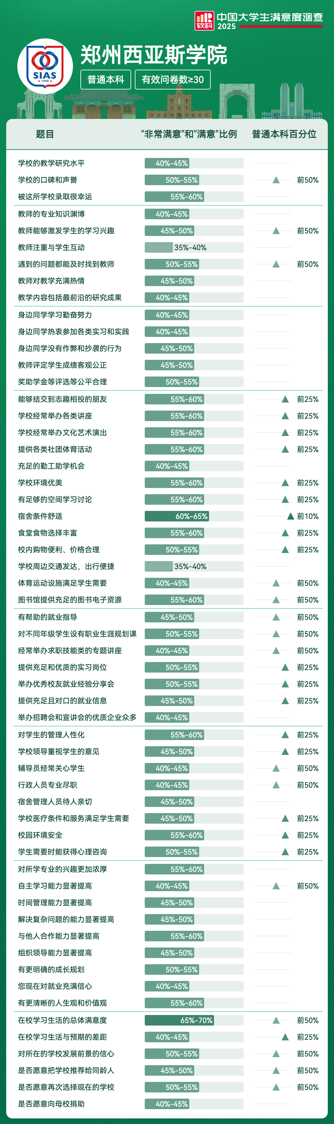| 宿舍条件舒适 | 60%-65% | 前10% |