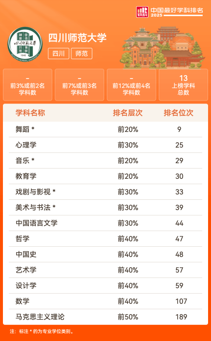 四川师范大学是四川省属重点大学、国家首批“中西部高校基础能力建设工程”支持高校及全国深化创新创业教育改革示范校,是四川省举办本科师范教育最早、师范类院校中办学历史最为悠久的大学。学校创建于1946年,其诞生与东北大学有直接的历史渊源。抗战初期,东北大学内迁到四川省三台县办学。抗战胜利后,东北大学迁回沈阳,留川师生在原校址上创建了私立川北农工学院。1949年,学校吸纳西山书院,更名为私立川北大学。1950年,学校合并私立川北文学院,组成公立川北大学,迁址四川省南充市,改称川北大学。1952年,以川北大学为主体,合并川东教育学院(原中国乡村建设学院)、四川大学和华西大学的部分专业,组建四川师范学院。1953年,原重庆师范学院部分系科师生进入四川师范学院。1956年,四川师范学院本科专业迁到成都狮子山。1964年,原成都大学(现西南财经大学)数理化三系并入学校。1985年,经国家教育委员会批准更名为四川师范大学。1999年,原煤炭部成都煤炭干部管理学院整体并入。四川师范大学位于四川省省会成都市,现有狮子山校区、成龙校区两个校区。