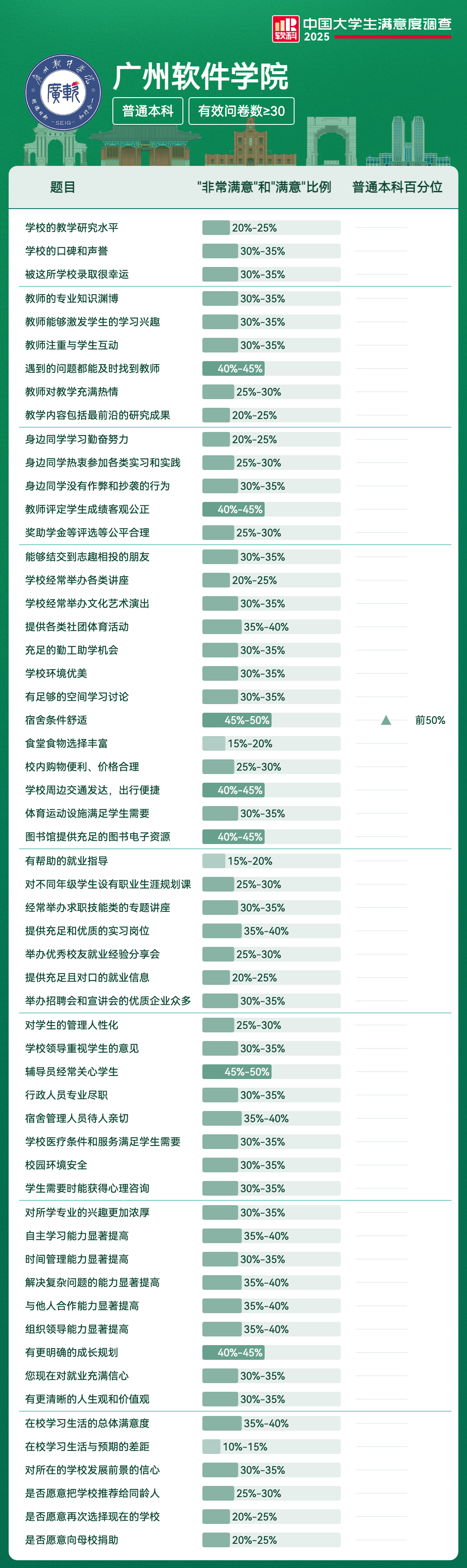 | 宿舍条件舒适 | 45%-50% | 前50% |