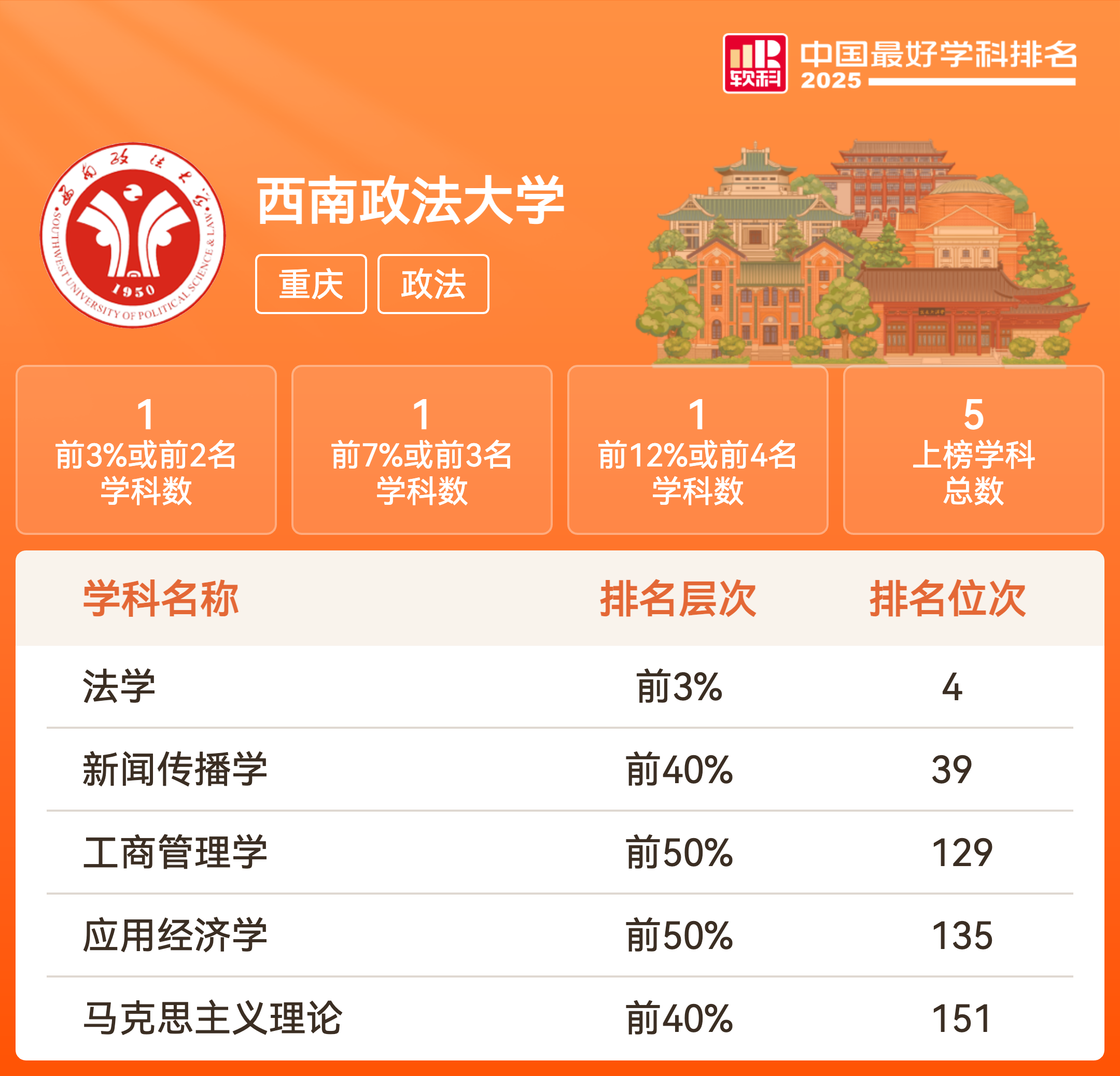 西南政法大学的前身为1950年创建的西南人民革命大学;1953年以西南人民革命大学政法系为基础,合并当时的重庆大学法学院、四川大学政法学院、重庆财经学院法律系、贵州大学法律系、云南大学法律系,正式成立西南政法学院;1958年中央公安学院重庆分院并入;1995年更名为西南政法大学。西南政法大学是教育部与重庆市人民政府共建的政法类高校。