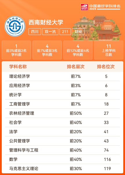 多样专业,实力雄厚 学校拥有13个一级学科,有金融学、政治经济学、会计学、统计学4个国家级重点学科,应用经济学入选“双一流”建设学科。学校现有38个本科专业,其中全国排名前10的专业有19个