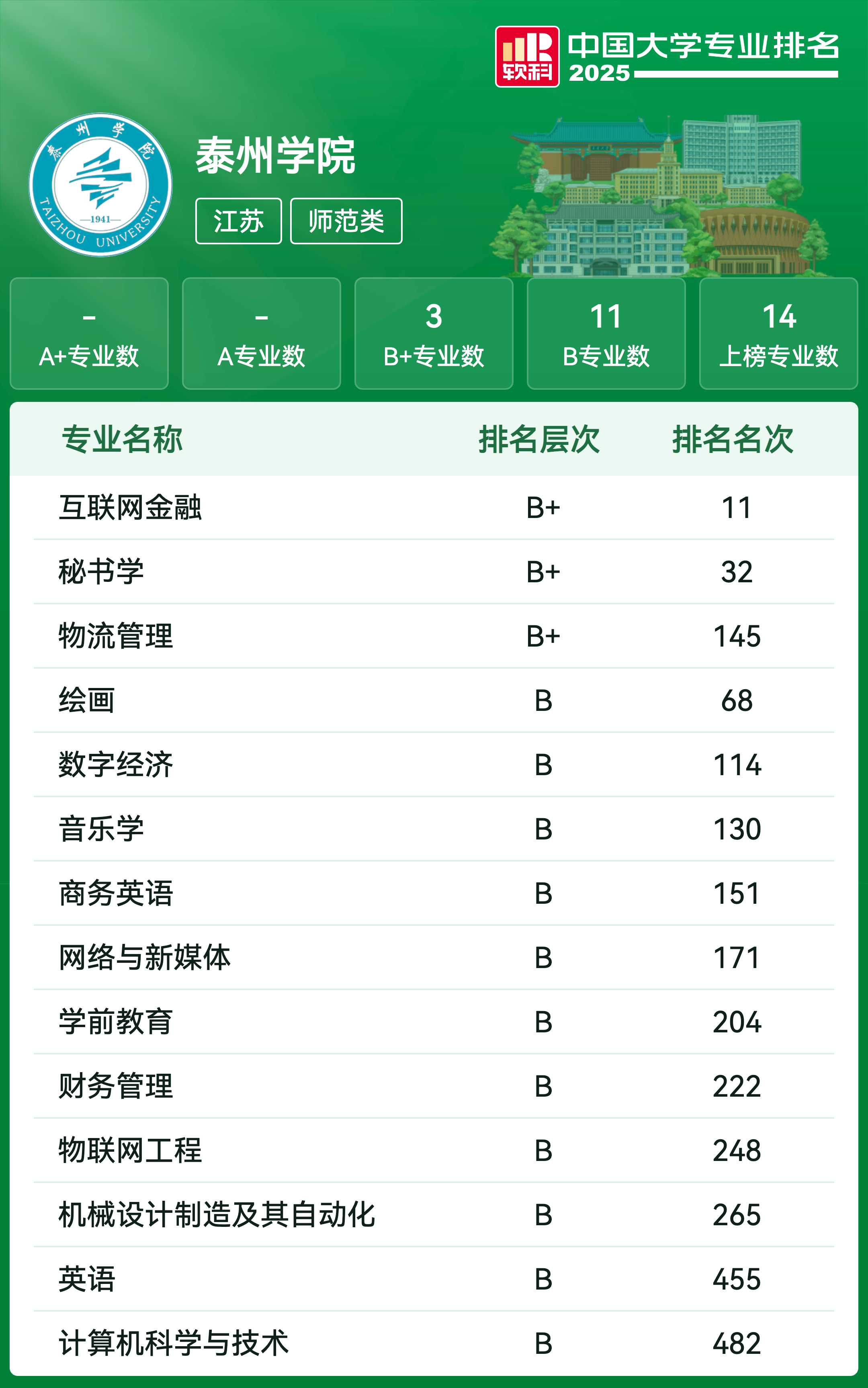| 专业代码 | 专业名称 | 评级 | 专业排名 |
