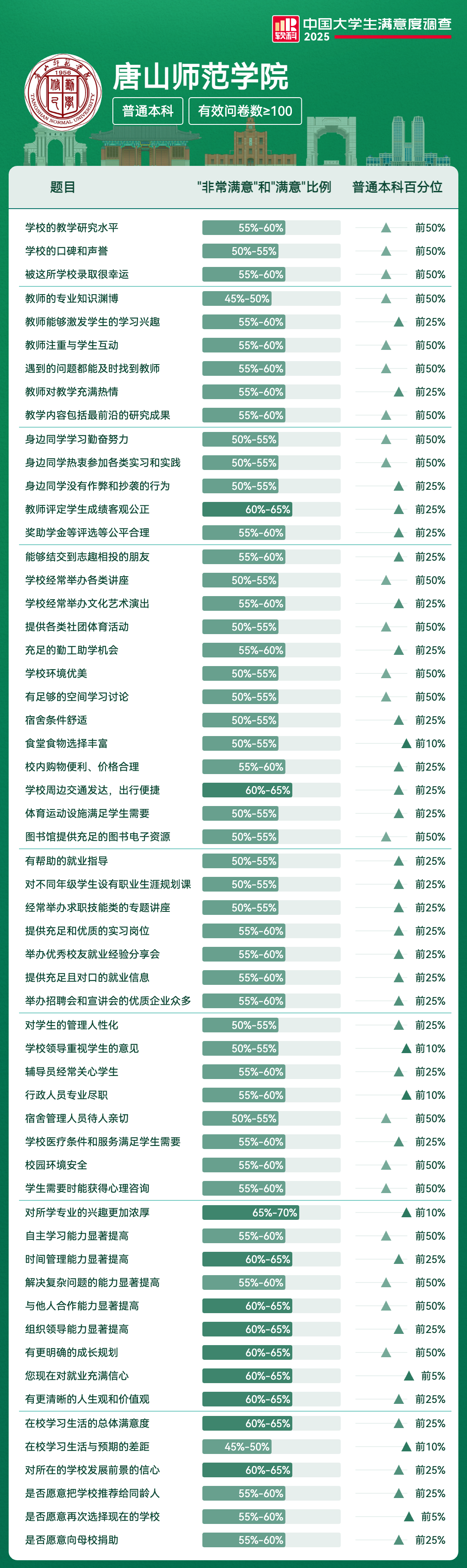 | 是否愿意再次选择现在的学校 | 55%-60% | 前5% |