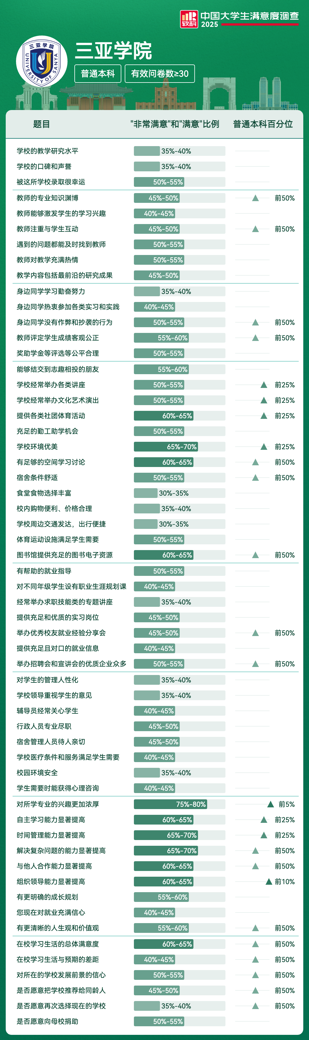 | 满意度前5项 | 满意及以上比例 | 全国高校排名区间 |