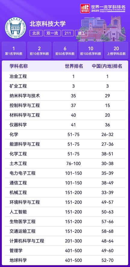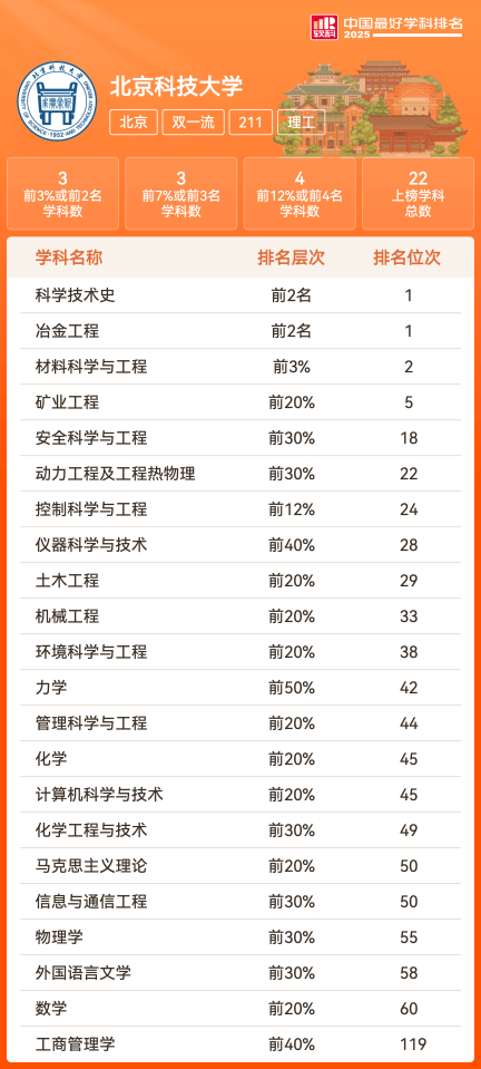 学科建设一流,优势专业众多 4个国家世界一流学科; 8个学科进入“软科世界一流学科排名”前100榜单,其中冶金工程世界第一; 23个国家一流建设专业;学校还有设有人工智能、机器人工程、大数据管理与应用、储能科学与工程、统计学等新兴专业。