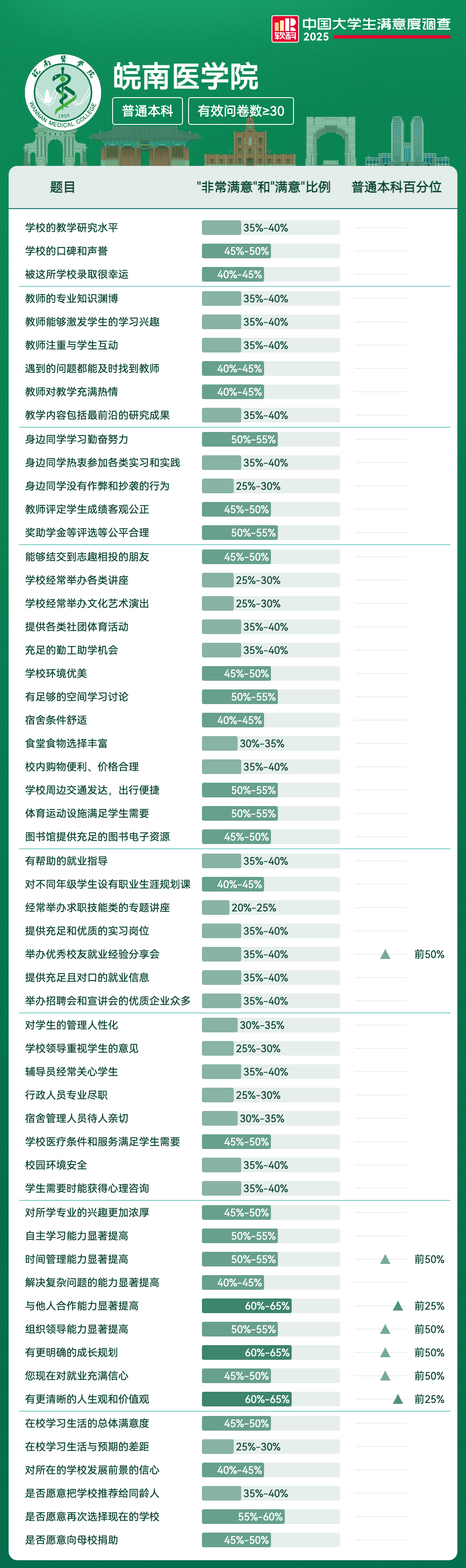 | 满意度前5项 | 满意及以上比例 | 全国高校排名区间 |