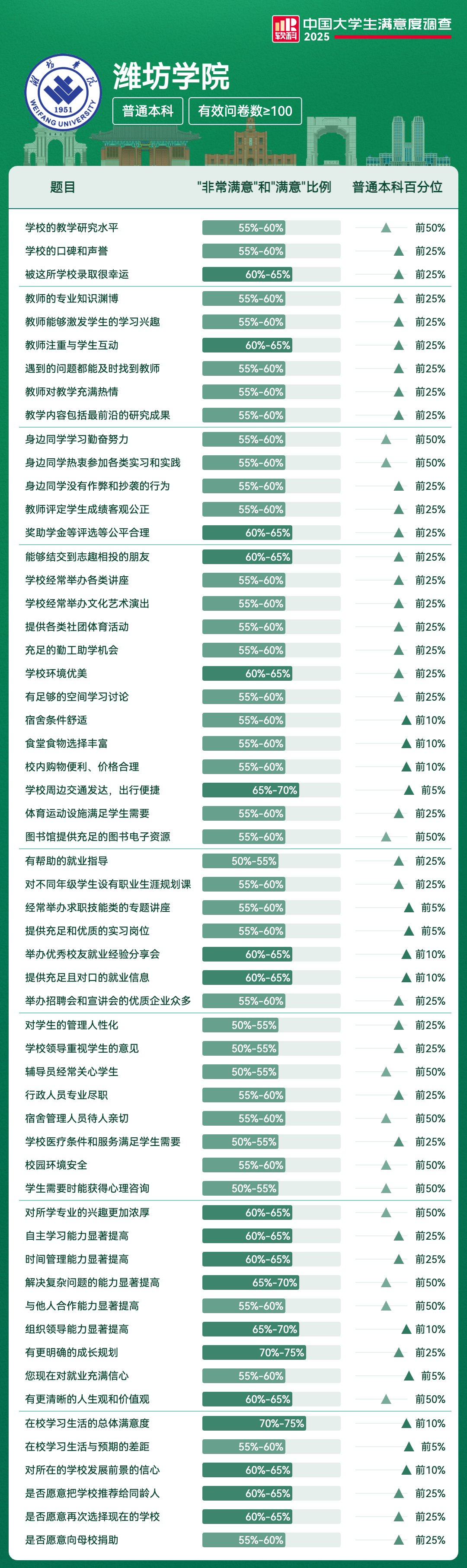 | 满意度前5项 | 满意及以上比例 | 全国高校排名区间 |