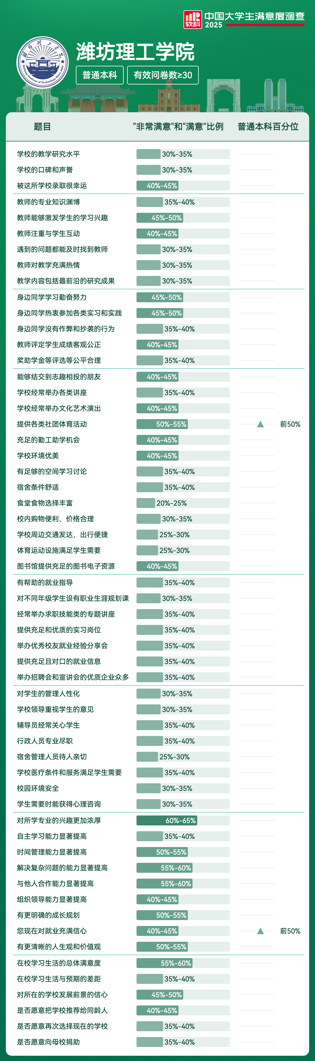 | 满意度前5项 | 满意及以上比例 | 全国高校排名区间 |