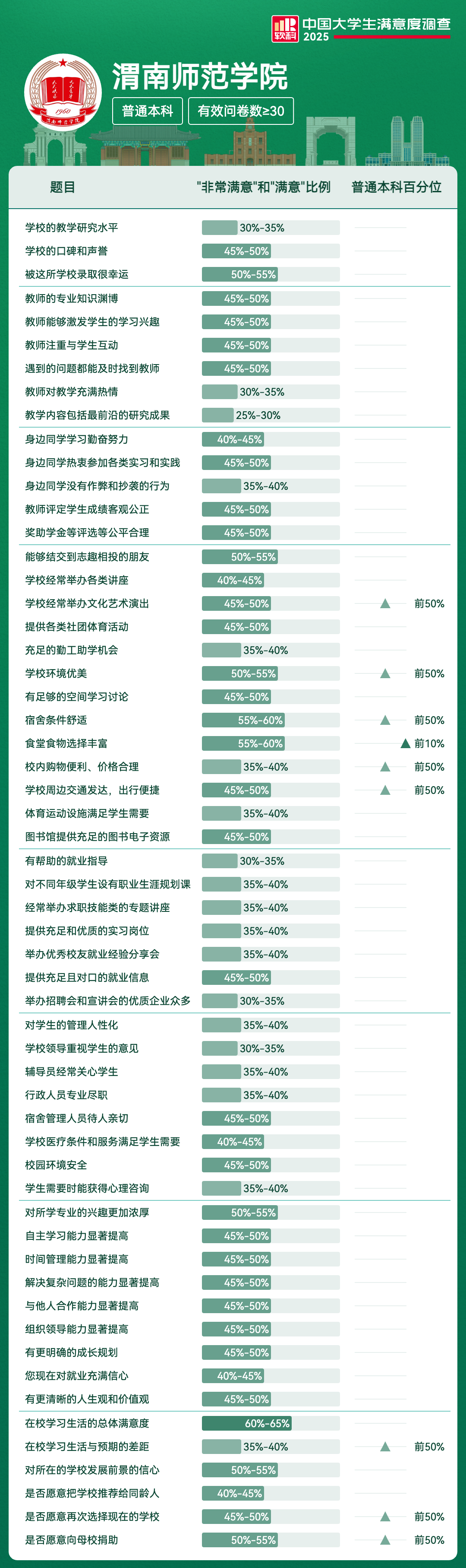 | 宿舍条件舒适 | 55%-60% | 前50% |