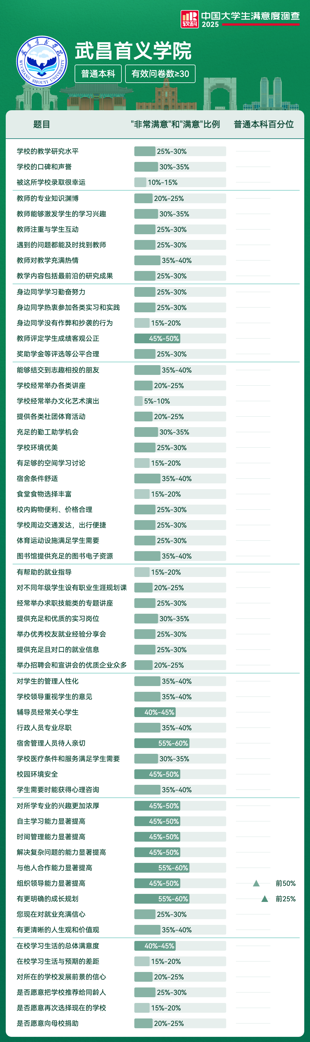 | 满意度前5项 | 满意及以上比例 | 全国高校排名区间 |