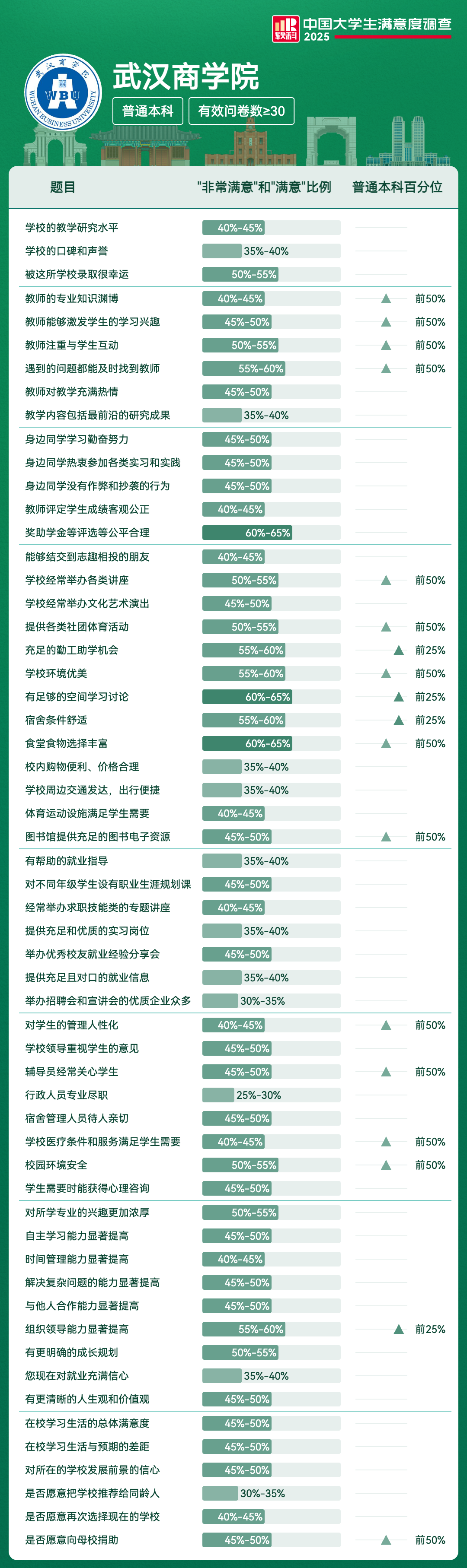 | 宿舍条件舒适 | 55%-60% | 前25% |