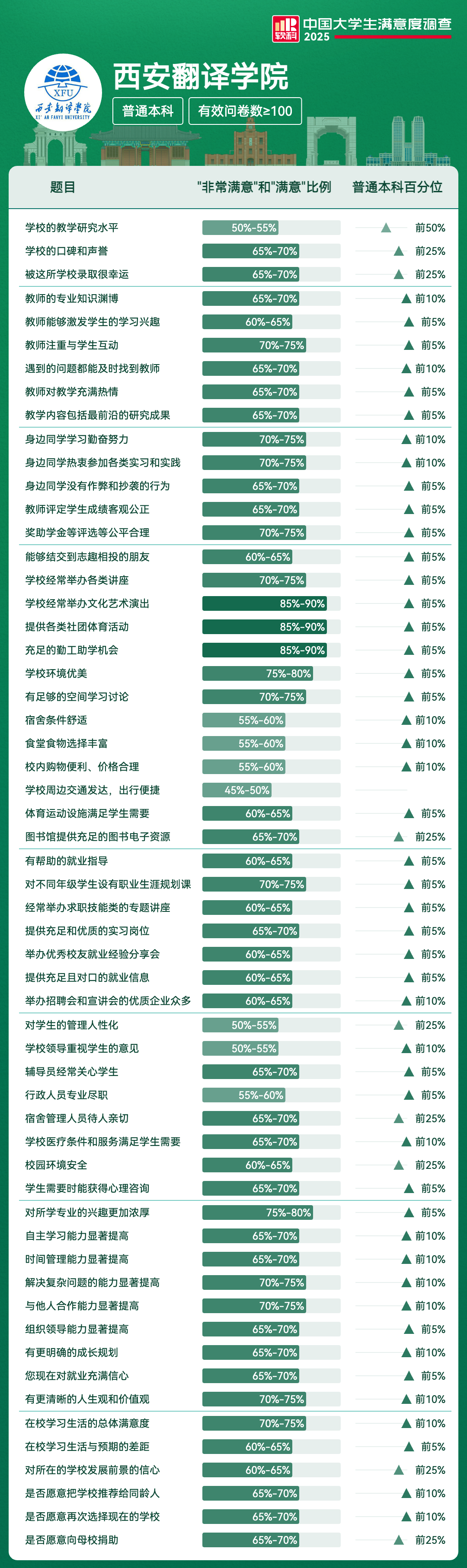 | 满意度前5项 | 满意及以上比例 | 全国高校排名区间 |