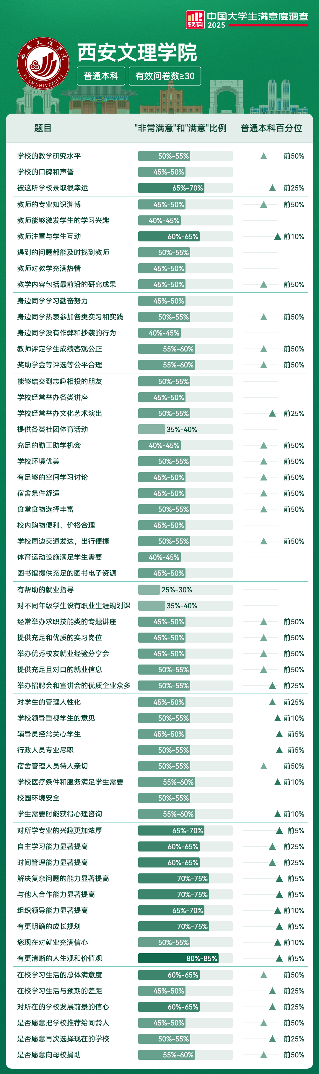 | 满意度前5项 | 满意及以上比例 | 全国高校排名区间 |