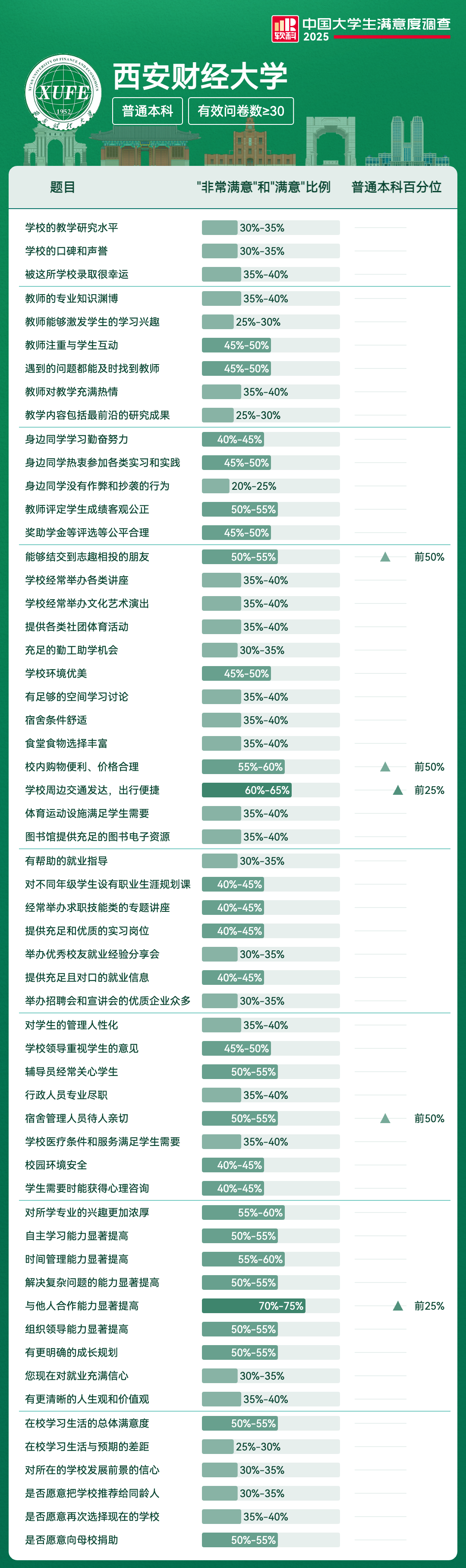 满意度前5项 | 满意及以上比例 | 全国高校排名区间 |
