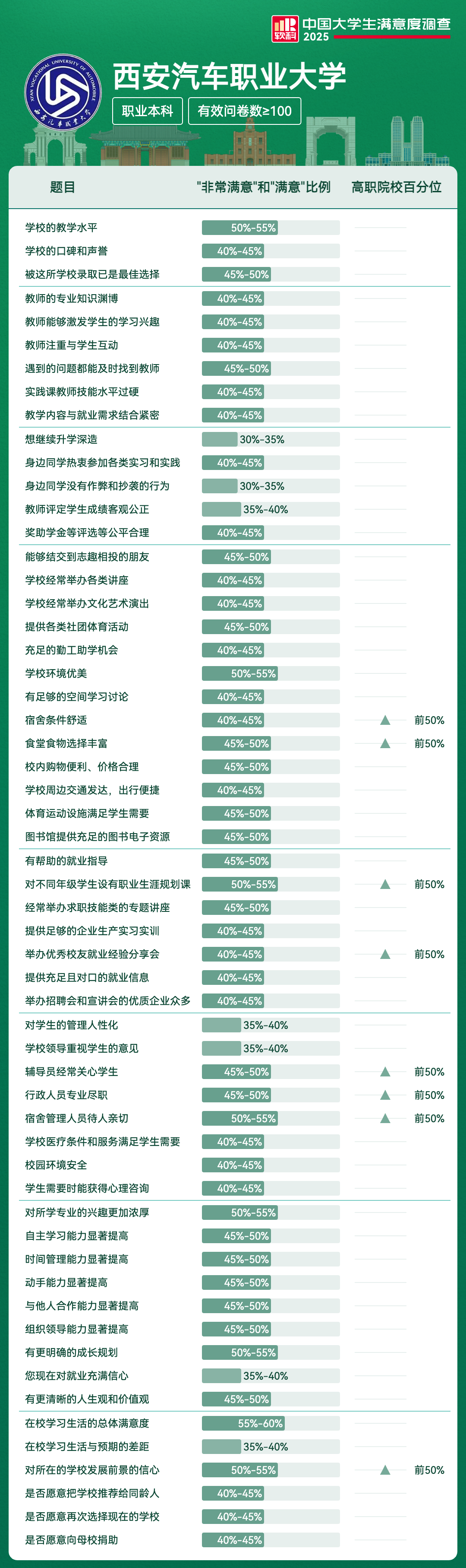 | 宿舍条件舒适 | 40%-45% | 前50% |